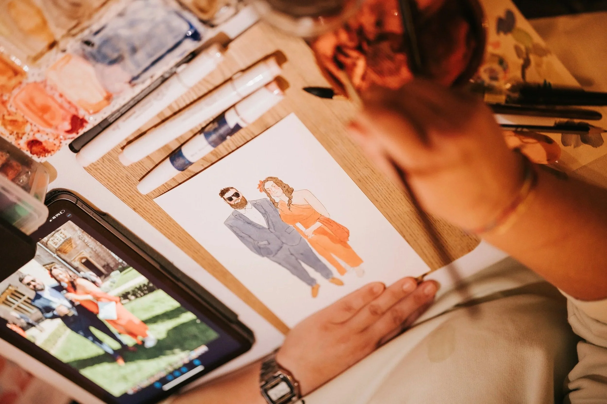 Illustrations of guests are often done in couples or pairs and I’ll usually draw full body portraits. Each illustration takes between 10 and 15 minutes depending on the number of people illustrated and the complexity of the details: so you we are looking on roughly 10/12 people per hour!When you book one of our Live Illustration Package, you will book a time slot but also a maximum number of illustrations that you will receive!